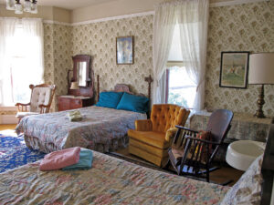 Across the hall are marquee accommodations that go for no more than $45 per night. A quartet of windows faces the river, and the room is big enough to sleep four in two beds. An area rug covers much of the hardwood floor. Three chairs are rockers and a fourth is an orange easy chair.