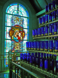Inside the limestone Votive Candle Chapel, at least 550 cobalt blue candleholders are arranged as an indoor pyramid, surrounded by stained glass windows.